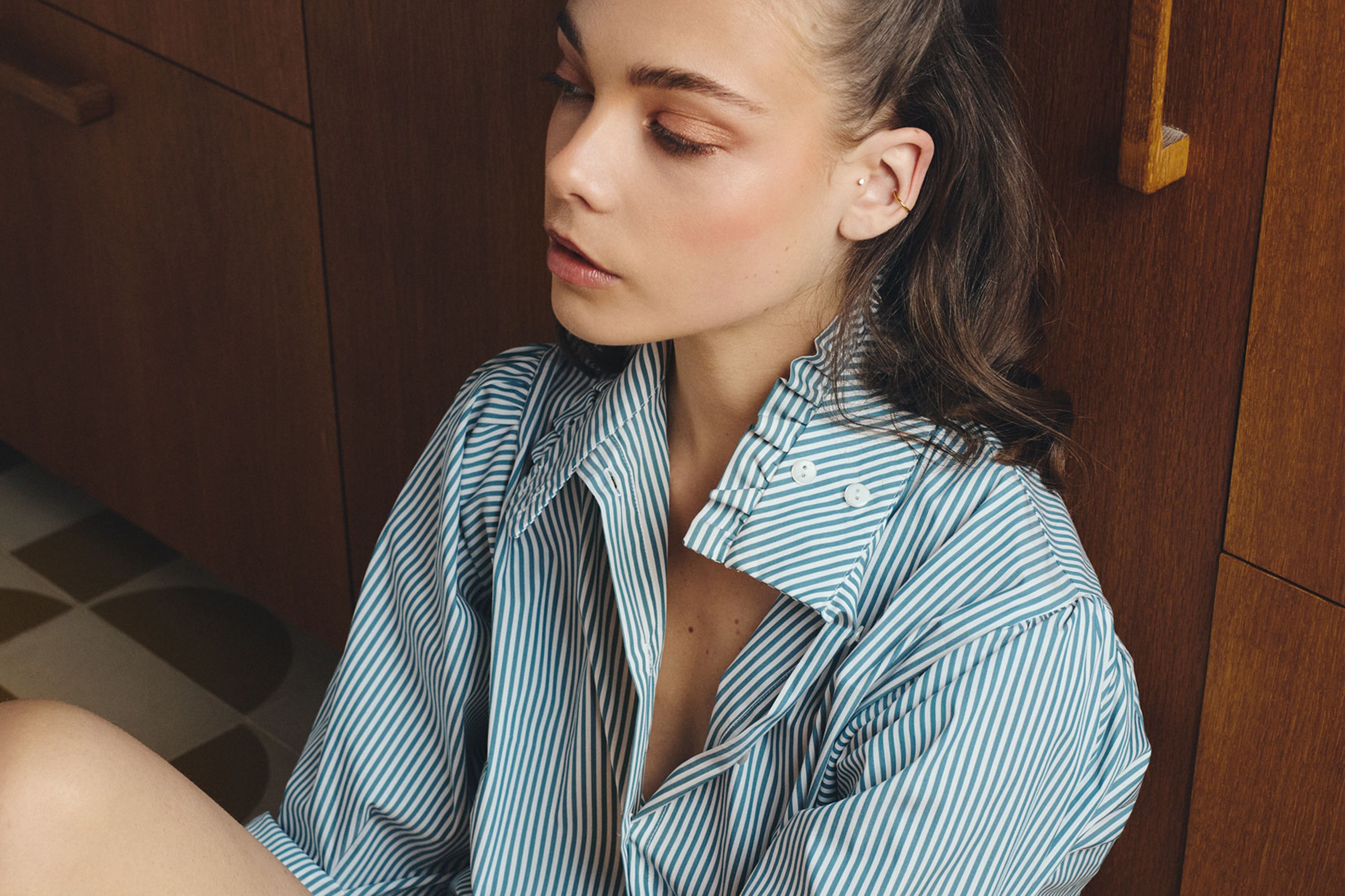 Chemise col montant à volants rayures bleues