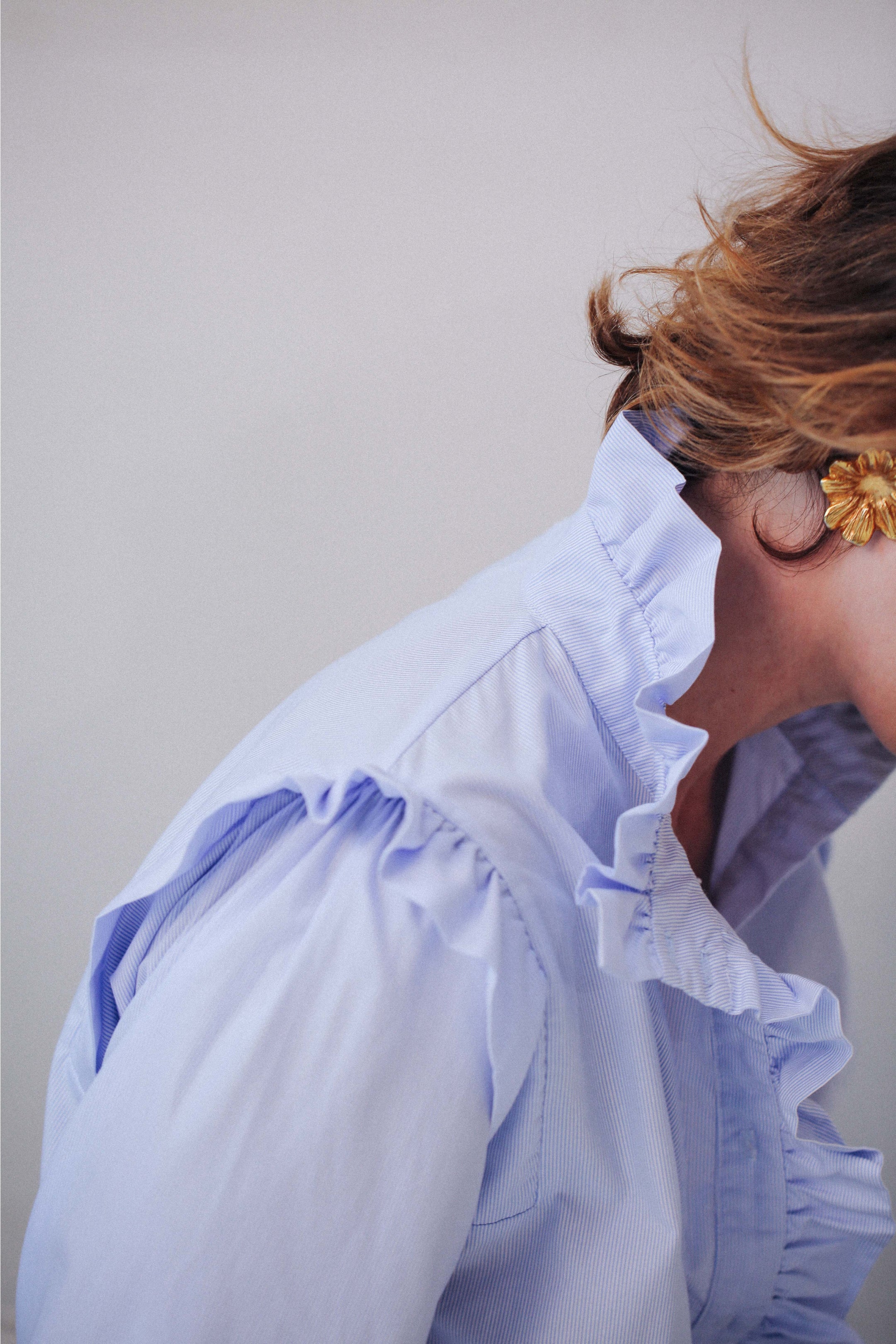 Famous for her role on Gossip Girl, iconic actress Kelly Rutherford wears the Romée ruffled collar shirt, a signature piece from the house.